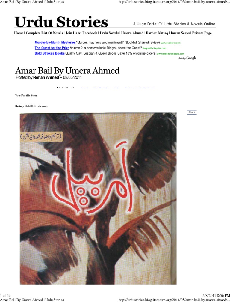 It includes following features. Amar bail novel by umera ahmed read online or download in pdf format for offline reading and enjoy a beautiful urdu love story. Free download pdf books by umaira ahmed. Its a narrative of imbalanced connections divided families lust for power complexes insecurities and endangering all issues of love its own strength and sacrifices.